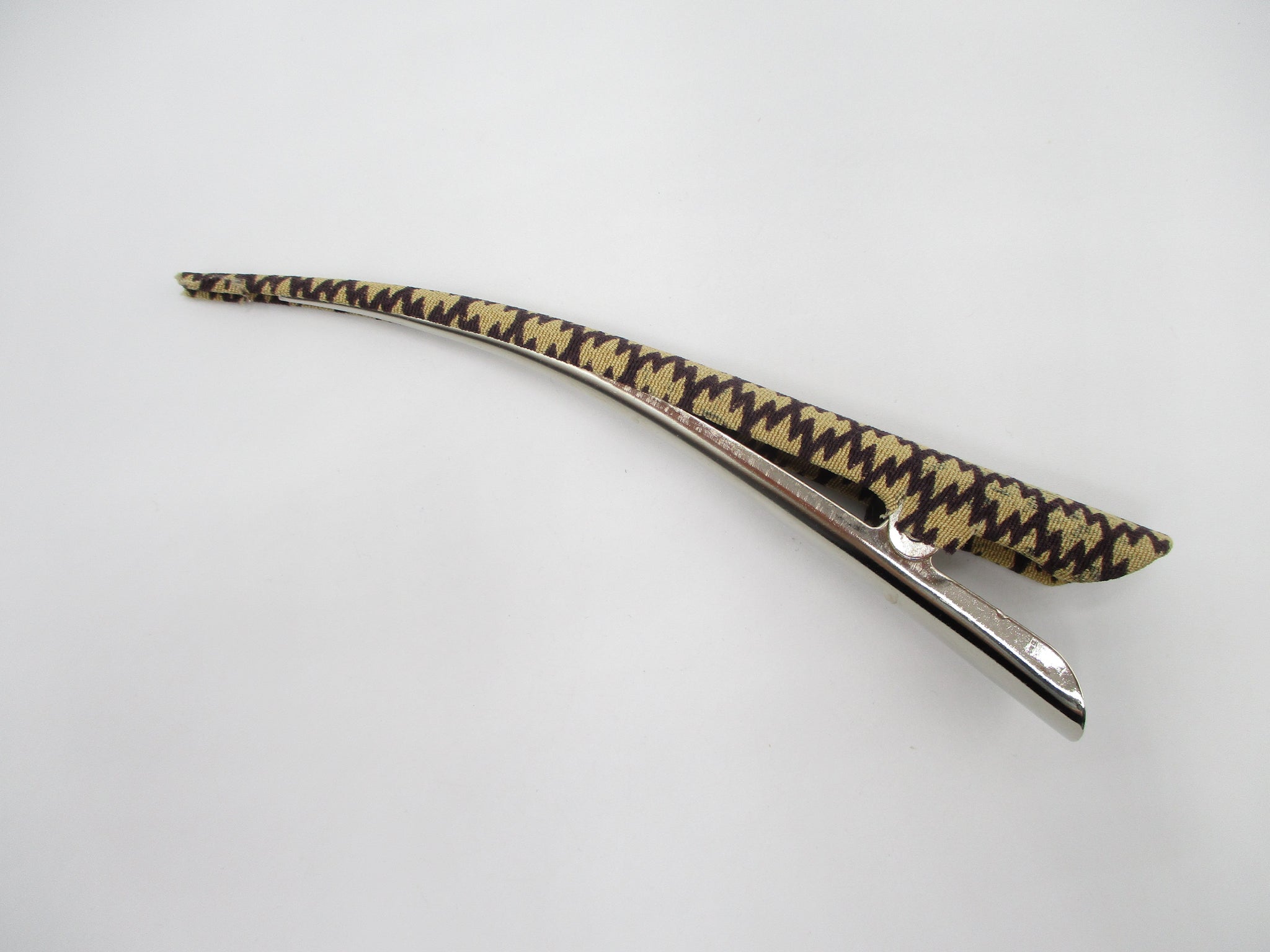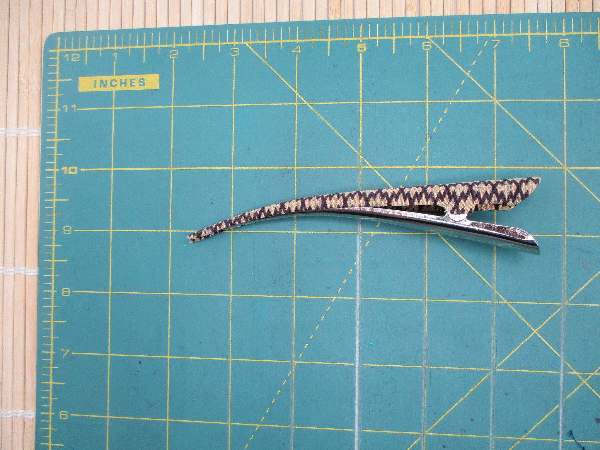 Vintage Silk Kimono Fabric is carefully applied to a sturdy metal clip.