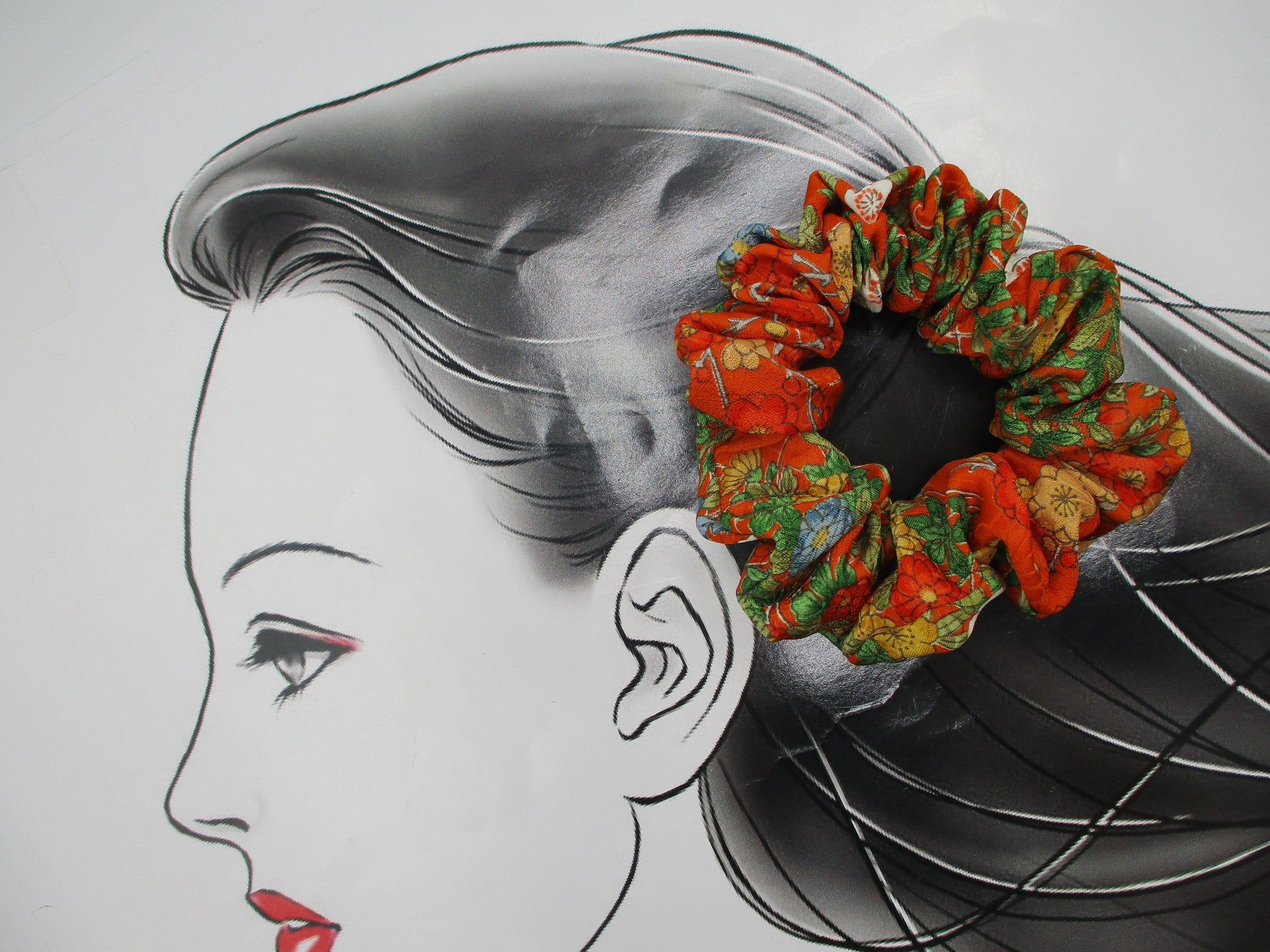 This is an Orange Floral Elegant Kimono Scrunchies, Upcycled Handmade Gift.